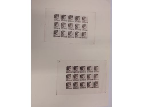 Sweden. Proof Facit P ★★, SVEN EWERT 'Kvinnohuvud' in block-of-240 test stamps in grey colour. The large unit have upper and lower margins. Sweden. Proof Facit P ★★, SVEN EWERT 'Kvinnohuvud' in block-of-240 test stamps in grey colour. The large unit have upper and lower margins. Visa mindre