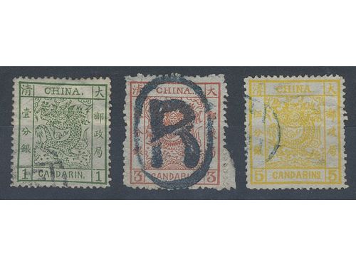 China, Empire. Michel 1–3 used, 1878–83 Large Dragon 1, 3 and 5 ca. Light blue chop on 5 candarins and striking R in ova.. Läs mer China, Empire. Michel 1–3 used, 1878–83 Large Dragon 1, 3 and 5 ca. Light blue chop on 5 candarins and striking R in oval on 3 candarins. 5 Candarins with small thin spot and crease. Visa mindre