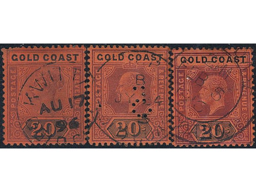 Gold Coast. SG 25, 48, 84 used, 1889–1913 Three different 20s mauve-purple on red issues. SG 25 with thin corner, 48 wit.. Läs mer Gold Coast. SG 25, 48, 84 used, 1889–1913 Three different 20s mauve-purple on red issues. SG 25 with thin corner, 48 with perfin "5" and extra hole. NO 84 fine. GBP 525 Visa mindre