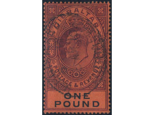 Gibraltar. SG 64 used, 1911 King Edward VII £1 Deep purple and black/red wmk multiple CA. GBP 750 Gibraltar. SG 64 used, 1911 King Edward VII £1 Deep purple and black/red wmk multiple CA. GBP 750 Visa mindre