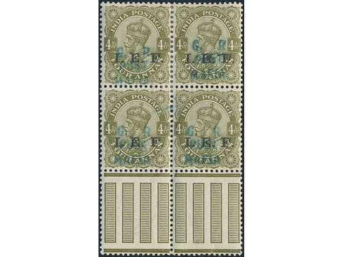 Tanganyika, Mafia Island. Michel 19 ★, 1917 Overprint in green on I.E.F 4 a olive-green, beautiful block of four with lo.. Läs mer Tanganyika, Mafia Island. Michel 19 ★, 1917 Overprint in green on I.E.F 4 a olive-green, beautiful block of four with lower printed margin. SG M49. EUR 800 Visa mindre