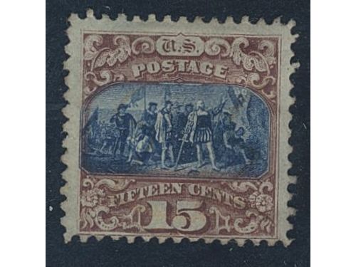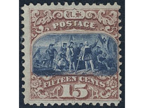 U.S.A. Michel 32 I ★, 1869 Different designs 15 c red-brown/blue type I, brownish gum. Almost imperceptibly hinged, depi.. Läs mer U.S.A. Michel 32 I ★, 1869 Different designs 15 c red-brown/blue type I, brownish gum. Almost imperceptibly hinged, depicting the Landing of Columbus, the rare type I, picture unframed, Scott #118 cat. $9500, very seldom seen on the market. EUR 7000 Visa mindre