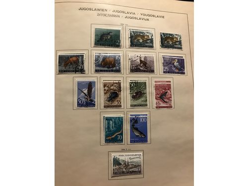 Yugoslavia. Collection ★/⊙ 1918–1956 in album. Many better stamps, e.g. MI 27–29 *, 33–50 mostly *, 63 used, s/s 4 A and.. Läs mer Yugoslavia. Collection ★/⊙ 1918–1956 in album. Many better stamps, e.g. MI 27–29 *, 33–50 mostly *, 63 used, s/s 4 A and B used, s/s 5 * and 730 *. Also some Montenegro, Serbia and Kroatia including an imprerf s/s 8U Storm Division without signs or certificate. Some stamps partially stuck. Please see a selection of scans at www.philea.se. Visa mindre