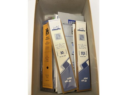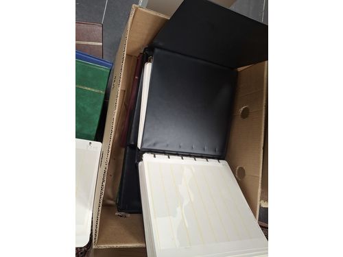 Accessories. Removal box with empty albums, binders and klämfix mm. Six FDC binders of which three with leaves. Ca. 50 new visir leaves, two boxes with klämfix in varied sizes, both clear and black, etc. Please inspect. Approx. 13 kg. Visa mindre