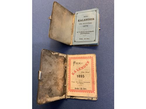 Antiques - Boxes, Sweden. Lot. Two pocket calendars with covers in silver + danish stamp pocket folder in leather.