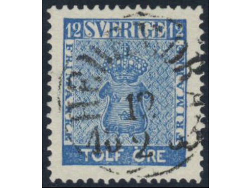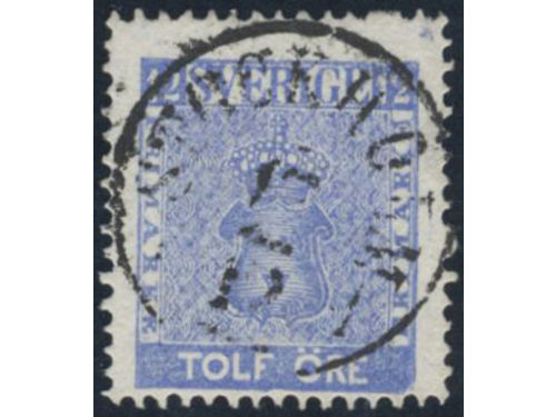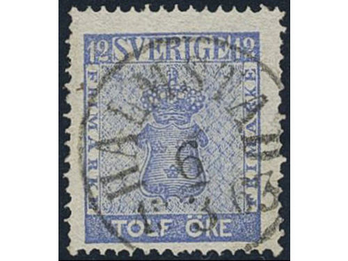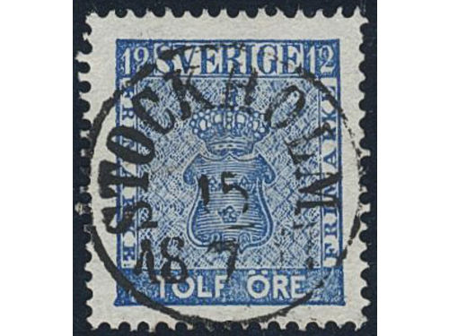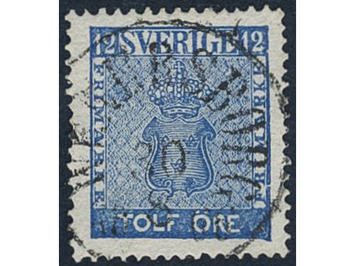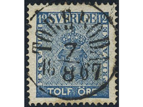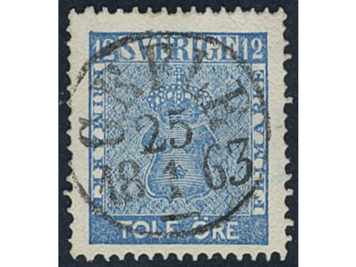 Sweden. Facit 9c3 used, 12 öre blue, perforation of 1865. EXCELLENT cancellation STOCKHOLM 15.7.1867. Position 81 plate 5. Some ink on the reverse. Sweden. Facit 9c3 used, 12 öre blue, perforation of 1865. EXCELLENT cancellation STOCKHOLM 15.7.1867. Position 81 plate 5. Some ink on the reverse. Visa mindre