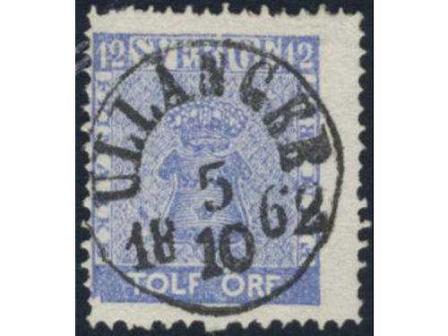 Sweden. Facit 9h1 used, 12 öre bright ultramarine with one double perf. EXCELLENT cancellation ULLÅNGER 5.10.1862. Allegedly, position 40 plate 4. Sweden. Facit 9h1 used, 12 öre bright ultramarine with one double perf. EXCELLENT cancellation ULLÅNGER 5.10.1862. Allegedly, position 40 plate 4. Visa mindre
