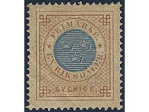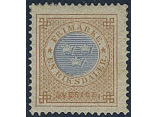Sweden. Facit 27a II ★, 1 Riksdaler yellowish brown/blue on yellowish paper, type 2 (retouched crowns). Weak crease. Sup.. Läs mer Sweden. Facit 27a II ★, 1 Riksdaler yellowish brown/blue on yellowish paper, type 2 (retouched crowns). Weak crease. Superb–EXCELLENT centering. SEK 11000 Visa mindre