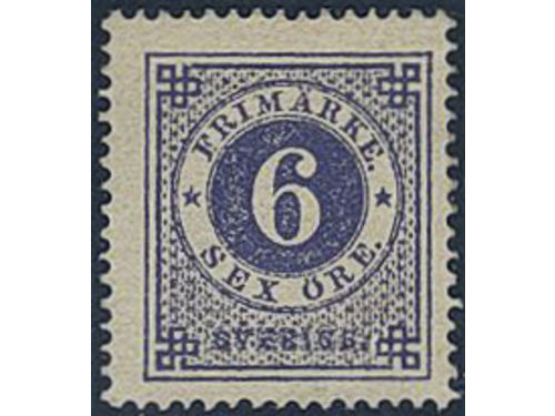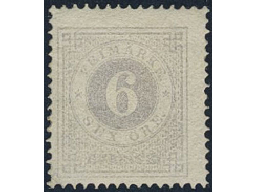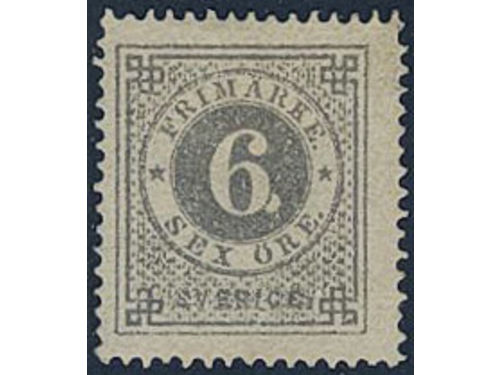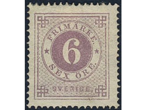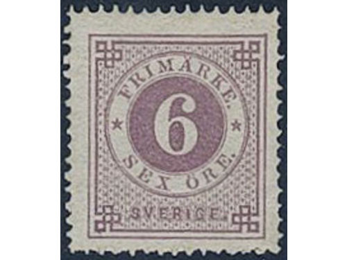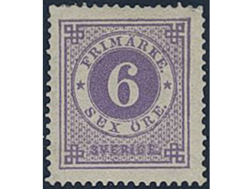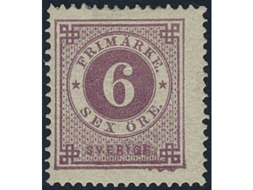 Sweden. Facit 20d ★, 6 öre bluish lilac smooth print. Small perf. imperfections. Superb centering. Opinion (shade) by O.P. SEK 4000 Sweden. Facit 20d ★, 6 öre bluish lilac smooth print. Small perf. imperfections. Superb centering. Opinion (shade) by O.P. SEK 4000 Visa mindre