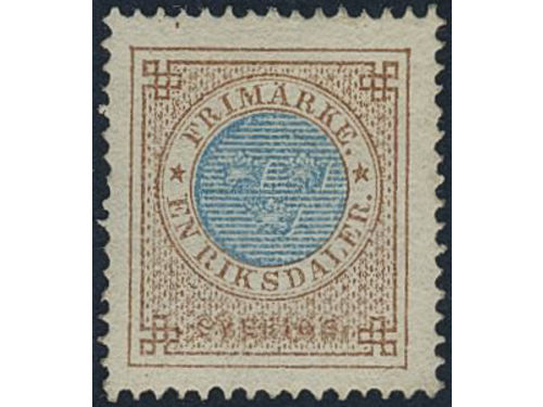 Sweden. Facit 27c ★, 1 Riksdaler yellowish brown/ultramarine. Weakly bent corner perfs. Small paper residues on reverse... Läs mer Sweden. Facit 27c ★, 1 Riksdaler yellowish brown/ultramarine. Weakly bent corner perfs. Small paper residues on reverse. Opinion (shade) by O.P. SEK 11000 Visa mindre
