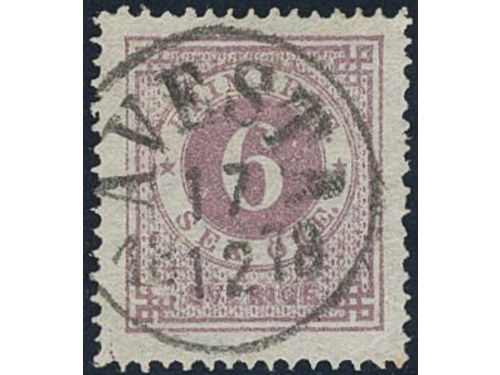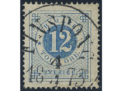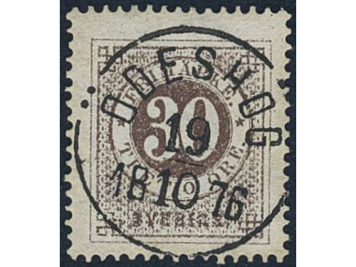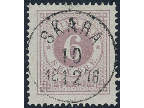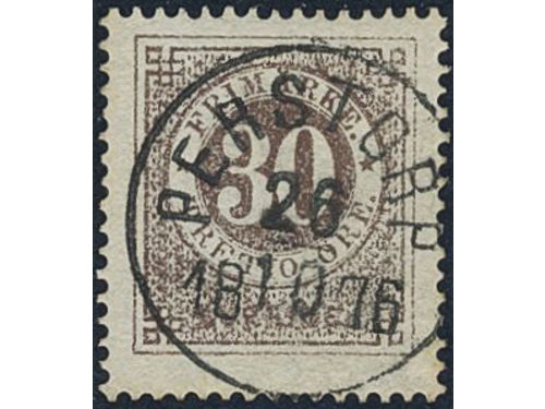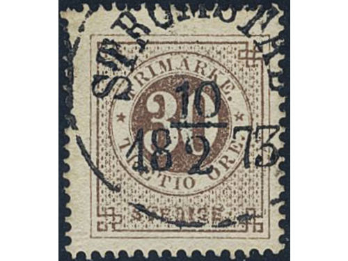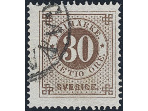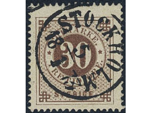 Sweden. Facit 25a1 used, 30 öre dark reddish brown on translucent paper. Beautiful example cancelled STOCKHOLM 5.1.1873... Läs mer Sweden. Facit 25a1 used, 30 öre dark reddish brown on translucent paper. Beautiful example cancelled STOCKHOLM 5.1.1873. Very scarce shade. Signed by O.P. SEK 5000 Visa mindre