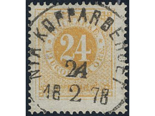 Sweden. Facit 24g used, 24 öre dull orange-dull yellowish orange. NYA KOPPARBERGET 24.2.1878. Light owner mark on the reverse. Sweden. Facit 24g used, 24 öre dull orange-dull yellowish orange. NYA KOPPARBERGET 24.2.1878. Light owner mark on the reverse. Visa mindre
