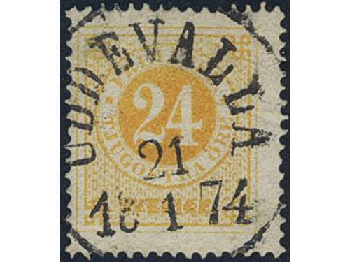 Sweden. Facit 24f used, 24 öre orange-yellow on ordinary paper. EXCELLENT cancellation UDDEVALLA 21.1.1874. Sweden. Facit 24f used, 24 öre orange-yellow on ordinary paper. EXCELLENT cancellation UDDEVALLA 21.1.1874. Visa mindre