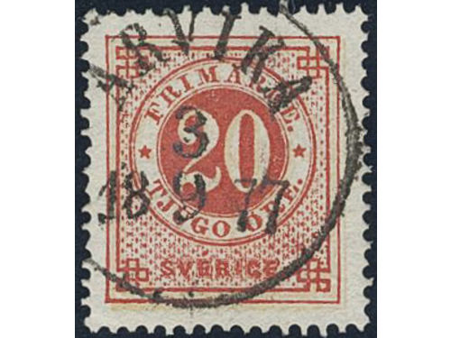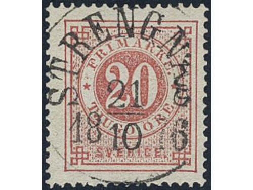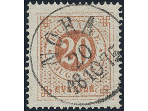Sweden. Facit 22e used, 20 öre brownish red. Very beautiful example cancelled NORA 20.10.1875. Sweden. Facit 22e used, 20 öre brownish red. Very beautiful example cancelled NORA 20.10.1875. Visa mindre