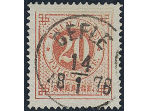 Sweden. Facit 23a used, 20/20 öre brick-red on pale orange. Superb cancellation GEFLE 14.1.1878. One somewhat short perf. Sweden. Facit 23a used, 20/20 öre brick-red on pale orange. Superb cancellation GEFLE 14.1.1878. One somewhat short perf. Visa mindre