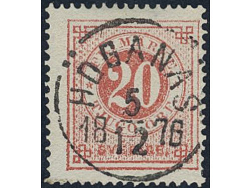 Sweden. Facit 22h used, 20 öre brick red. EXCELLENT cancellation HÖGANÄS 5.12.1876. Sweden. Facit 22h used, 20 öre brick red. EXCELLENT cancellation HÖGANÄS 5.12.1876. Visa mindre