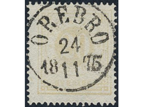Sweden. Facit 22f used, 20 öre pale orange. EXCELLENT cancellation ÖREBRO 24.11.1875. A few slightly short perfs. Sweden. Facit 22f used, 20 öre pale orange. EXCELLENT cancellation ÖREBRO 24.11.1875. A few slightly short perfs. Visa mindre