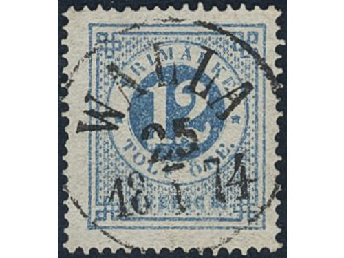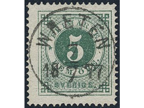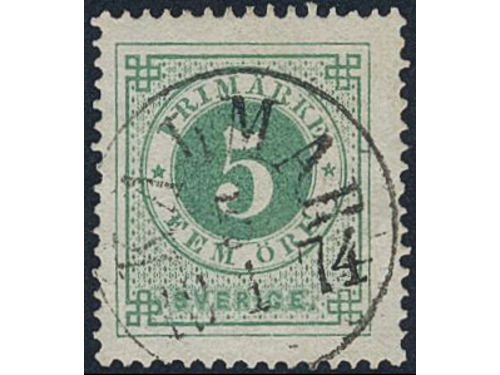 Sweden. Facit 19b used, 5 öre light bluish green on white paper. Superb cancellation KALMAR 5.1.1874. Sweden. Facit 19b used, 5 öre light bluish green on white paper. Superb cancellation KALMAR 5.1.1874. Visa mindre