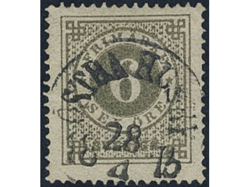Sweden. Facit 17d used, 3 öre orange-brown on yellowish paper. Superb cancellation STOCKHOLM 6.TUR 8.4. Signed by O.P. Sweden. Facit 17d used, 3 öre orange-brown on yellowish paper. Superb cancellation STOCKHOLM 6.TUR 8.4. Signed by O.P. Visa mindre
