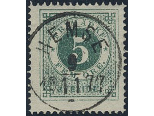 Sweden. Facit 19h used, 5 öre dull bluish green, unclean colour. EXCELLENT cancellation HEMSE 9.11.1877. Opinion (shade) by HOW (2011). Sweden. Facit 19h used, 5 öre dull bluish green, unclean colour. EXCELLENT cancellation HEMSE 9.11.1877. Opinion (shade) by HOW (2011). Visa mindre