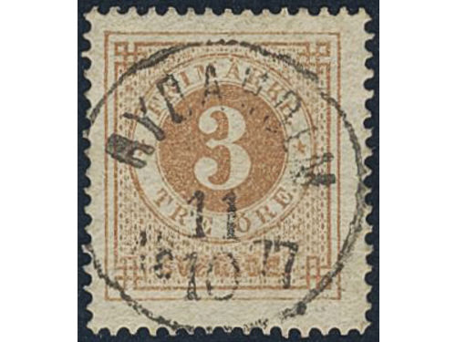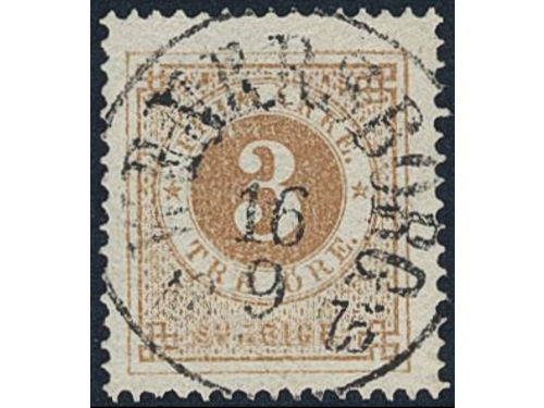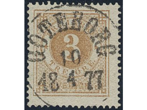 Sweden. Facit 17h used, 3 öre olivish orange-brown. EXCELLENT cancellation GÖTEBORG 10.4.1877. Slightly short perf. Signed by O.P. Sweden. Facit 17h used, 3 öre olivish orange-brown. EXCELLENT cancellation GÖTEBORG 10.4.1877. Slightly short perf. Signed by O.P. Visa mindre