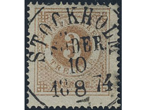 Sweden. Facit 17b used, 3 öre yellow-brown on smooth paper. Superb cancellation STOCKHOLM SÖDER 10.4.1873. Scarce shade.. Läs mer Sweden. Facit 17b used, 3 öre yellow-brown on smooth paper. Superb cancellation STOCKHOLM SÖDER 10.4.1873. Scarce shade in this quality. Signed by O.P. Visa mindre