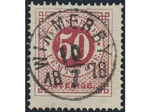 Sweden. Facit 26g used, 50 öre reddish carmine. EXCELLENT cancellation WIMMERBY 10.7.1878. Sweden. Facit 26g used, 50 öre reddish carmine. EXCELLENT cancellation WIMMERBY 10.7.1878. Visa mindre
