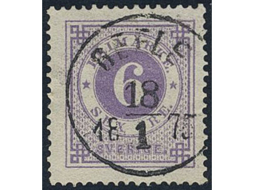 Sweden. Facit 20d used, 6 öre bluish lilac smooth print. Superb cancellation GEFLE 18.1.1875. One slightly short perf. tip. Sweden. Facit 20d used, 6 öre bluish lilac smooth print. Superb cancellation GEFLE 18.1.1875. One slightly short perf. tip. Visa mindre
