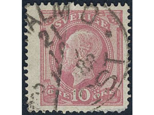 Sweden. Facit 45v17 used, 1886 Oscar II with posthorn on back 10 öre red, with paper fold before printing. Cancelled MAL.. Läs mer Sweden. Facit 45v17 used, 1886 Oscar II with posthorn on back 10 öre red, with paper fold before printing. Cancelled MALMÖ 2.POST 21.10.1888. Very scarce, only two recorded according to Facit. Some imperfections incl. a round corner. Visa mindre