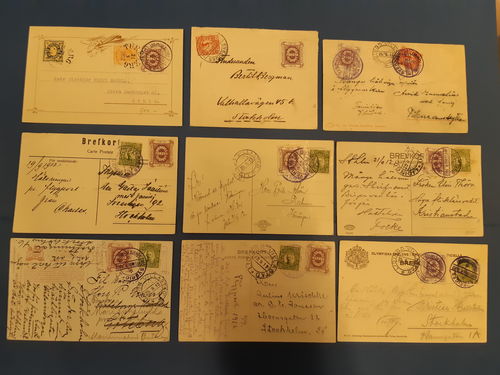Sweden. Semi-official air mail Facit HF1 on cover, Semi official air mail stamp (60 öre) on one cover and eight postcard.. Läs mer Sweden. Semi-official air mail Facit HF1 on cover, Semi official air mail stamp (60 öre) on one cover and eight postcards sent domestically.The entire lot is presented at www.philea.se. Nice lot. (9). Visa mindre