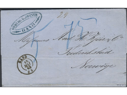 Norway. Prephilately. Incoming letter sent from GAND 15.MAI.65 via SÖDRA ST:BANAN 18.5.1865 and SVINESUND 21.5.1865 to Fredrikstad. Norway. Prephilately. Incoming letter sent from GAND 15.MAI.65 via SÖDRA ST:BANAN 18.5.1865 and SVINESUND 21.5.1865 to Fredrikstad. Visa mindre