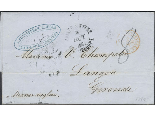 Guadeloupe. Prephilately. Letter sent from POINTE-A-PITRE GUADELOUPE (10).OCT.1864 to France, with arrival pmk LANGON 31.OCT.64. Guadeloupe. Prephilately. Letter sent from POINTE-A-PITRE GUADELOUPE (10).OCT.1864 to France, with arrival pmk LANGON 31.OCT.64. Visa mindre