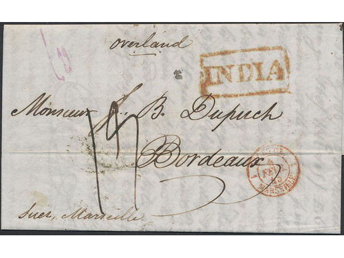 India. Prephilately, Prephilately. Letter from Calcutta red rectangular postmark INDIA on cover to France, on back postm.. Läs mer India. Prephilately, Prephilately. Letter from Calcutta red rectangular postmark INDIA on cover to France, on back postmark STEAMER POSTAGE (8) INLAND Do (7) TOTAL (15 as), on front MARSEILLE 4 FEVR 45 and postage due marks, on back BORDEAUX 7 FEVR 43. Visa mindre