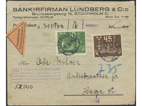 Sweden. Facit 197, 204 on cover, 10+45 öre on cash on delivery cover sent from STOCKHOLM 23.12.24 to Norway with arrival pmk KRISTIANIA 27.XII.24. Sweden. Facit 197, 204 on cover, 10+45 öre on cash on delivery cover sent from STOCKHOLM 23.12.24 to Norway with arrival pmk KRISTIANIA 27.XII.24. Visa mindre