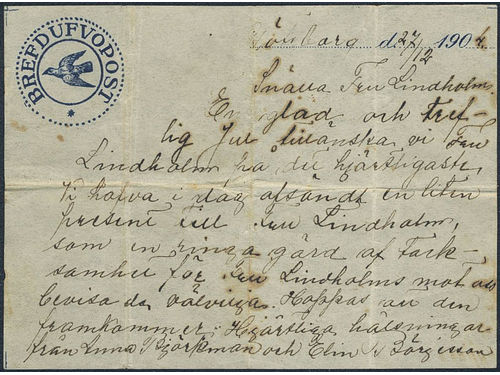 Sweden. Postal documentation, Carrier pigeon letter ('Brefdufvpost) dated '27.12.1904'. Folded several times, for natura.. Läs mer Sweden. Postal documentation, Carrier pigeon letter ('Brefdufvpost) dated '27.12.1904'. Folded several times, for natural reasons. Scarce and interesting. Visa mindre