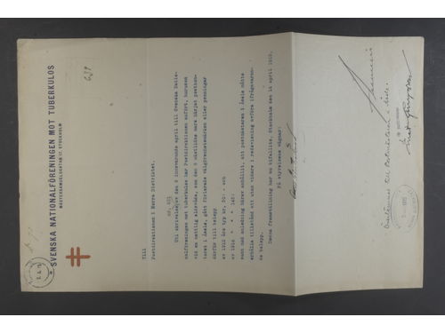 Sweden. Postal documentation, Missive with letterhead from the Swedish National Association against Tuberculosis, regard.. Läs mer Sweden. Postal documentation, Missive with letterhead from the Swedish National Association against Tuberculosis, regarding lost charity stamps or money, as a result of a fire at the post office in Åsele. Cancelled ÅSELE 7.5.15. Highly interesting 'Interrupted mail'-related item. Visa mindre