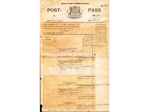 Sweden. Postal form, POST PASSPORT ('POST-PASS'), used from Anundsjö to Åsele, with information about the time for arriv.. Läs mer Sweden. Postal form, POST PASSPORT ('POST-PASS'), used from Anundsjö to Åsele, with information about the time for arrival and departure of mail from the post offices, etc. in Bredbyn, PKXP No 60, Hällaström, Gafsele, Östernoret and Åsele. Very scarce and sought-after. Visa mindre