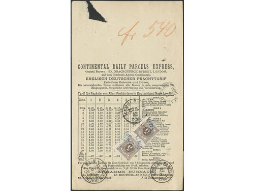 Sweden. Postage due Facit L13 on cover, 2×5 öre (pair) as postage due on unpaid address card for insured parcel sent fro.. Läs mer Sweden. Postage due Facit L13 on cover, 2×5 öre (pair) as postage due on unpaid address card for insured parcel sent from Great Britain to UPSALA 19.2.1885 (blue pmks). Small paper loss. Visa mindre
