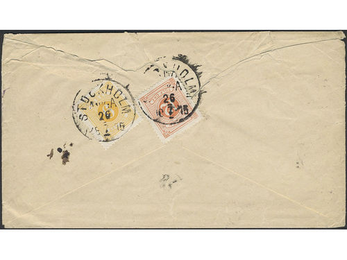 Sweden. Postage due Facit L13a on cover, 5 öre as postage due on local cover, prepaid with a local post 'STOCKHOLMS STAD.. Läs mer Sweden. Postage due Facit L13a on cover, 5 öre as postage due on local cover, prepaid with a local post 'STOCKHOLMS STADSPOST' stamp 5 öre, then taxed and paid with 5 öre STOCKHOLM 27.5.1889 after the letter was dropped in the wrong box. Postage due mark Lösen 5 örein violet colour. Interesting item. Visa mindre