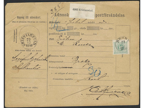Sweden. Postage due Facit L18 on cover, 30 öre as postage due on address card for unpaid parcel sent from KRISTIANSTAD 2.. Läs mer Sweden. Postage due Facit L18 on cover, 30 öre as postage due on address card for unpaid parcel sent from KRISTIANSTAD 23.12.1890 to BROBY 23.12.1890. Visa mindre