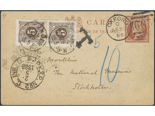 Sweden. Postage due Facit L13 on cover, 2×5 öre (pair) as postage due on insufficiently prepaid postcards sent from OXFO.. Läs mer Sweden. Postage due Facit L13 on cover, 2×5 öre (pair) as postage due on insufficiently prepaid postcards sent from OXFORD 30.AP.88, Great Britain to STOCKHOLM LGL 25.5.1888. Visa mindre