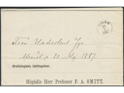 Sweden. Postage due Facit L13 on cover, 2×5 öre (pair) on unpaid cover 'Ornitologska iakttagelser' sent from SINGÖ 21.5... Läs mer Sweden. Postage due Facit L13 on cover, 2×5 öre (pair) on unpaid cover 'Ornitologska iakttagelser' sent from SINGÖ 21.5.1887 to STOCKHOLM ANK A 23.5.1887. Visa mindre
