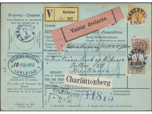 Sweden. Official Facit Tj23, 24B, 39, etc. on cover, 2+30+50 öre + 1+2×5 kr on address card for parcel sent from KARLSTA.. Läs mer Sweden. Official Facit Tj23, 24B, 39, etc. on cover, 2+30+50 öre + 1+2×5 kr on address card for parcel sent from KARLSTAD 16.12.15 via CHARLOTTENBERG 17.12.1915 to Kristiania 17.XII.15, Norway. Two stamps folded over the edge of the card. Visa mindre