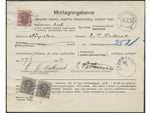 Sweden. Official Facit Tj40, 46 on cover, 2×1+8 öre on postal form for return receipt used for registered letter sent fr.. Läs mer Sweden. Official Facit Tj40, 46 on cover, 2×1+8 öre on postal form for return receipt used for registered letter sent from RIMFORSA 25.3.12 to HÄGERSTAD 30.3.12. Visa mindre