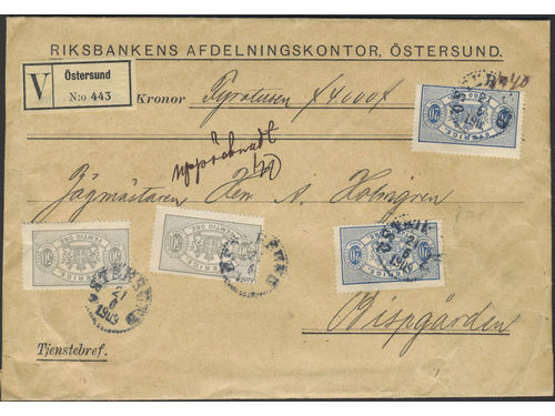Sweden. Official Facit Tj19, 23 on cover, 2×20+2×50 öre on insured cover with listed content, sent from ÖSTERSUND 21.6.1909 to Bispgården. Sweden. Official Facit Tj19, 23 on cover, 2×20+2×50 öre on insured cover with listed content, sent from ÖSTERSUND 21.6.1909 to Bispgården. Visa mindre