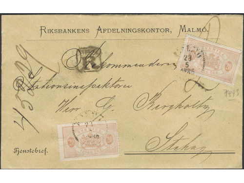Sweden. Official Facit Tj18 on cover, 2×20 öre on insured cover sent from MALMÖ 23.5.1885 to Stehag. Sweden. Official Facit Tj18 on cover, 2×20 öre on insured cover sent from MALMÖ 23.5.1885 to Stehag. Visa mindre