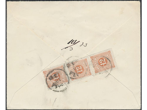 Sweden. Postage due Facit L15, F32b on cover, 3×12 öre in strip of three as postage due on insufficiently prepaid 2-fold.. Läs mer Sweden. Postage due Facit L15, F32b on cover, 3×12 öre in strip of three as postage due on insufficiently prepaid 2-fold cover sent from STOCKHOLM 9.3.1888 to Uppsala. Visa mindre
