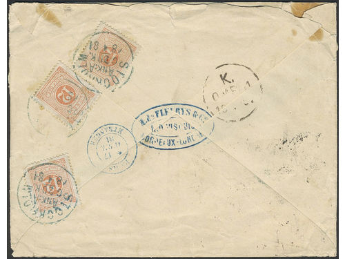 Sweden. Postage due Facit L5 on cover, 3×23 öre as postage due on insufficiently prepaid cover sent from BORDEAUX GIROND.. Läs mer Sweden. Postage due Facit L5 on cover, 3×23 öre as postage due on insufficiently prepaid cover sent from BORDEAUX GIRONDE 15.AVRIL.81 to STOCKHOLM ANK A C K 20.4.1881 (pmk in green-blue colour). The front with long tear repaired with tape. One stamp with defective corner. Visa mindre
