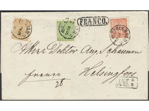 Sweden. Facit 14B, 7, 16 on cover, 3+5+20 öre on beautiful cover sent from STOCKHOLM 2.9.1870 to Finland with arrival pmk ANK 4.9. Sweden. Facit 14B, 7, 16 on cover, 3+5+20 öre on beautiful cover sent from STOCKHOLM 2.9.1870 to Finland with arrival pmk ANK 4.9. Visa mindre
