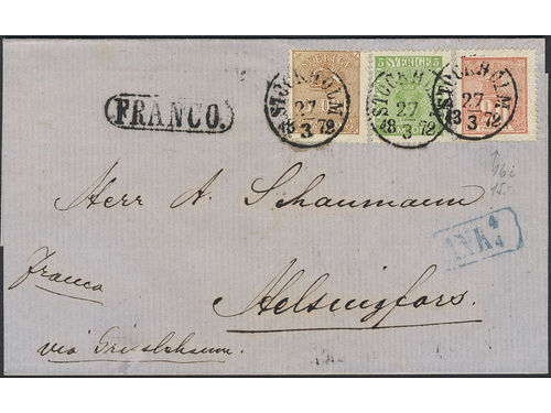 Sweden. Facit 16, 7, 14B on cover, 3+5+20 öre on cover sent from STOCKHOLM 27.3.1872 to Finland with arrival pmk ANK 4.4. Sweden. Facit 16, 7, 14B on cover, 3+5+20 öre on cover sent from STOCKHOLM 27.3.1872 to Finland with arrival pmk ANK 4.4. Visa mindre